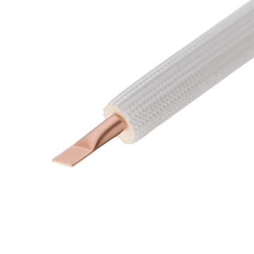 Pre-insulated coupled copper tube produced in compliance with current regulations The copper pipe complies with UNI EN 12735-1:2020 "round copper pipes for air conditioning and refrigeration systems" and is made of a CU-DHP alloy, annealed in phosphorus deoxidized rolls, with a minimum copper content of 99 .9% and phosphorus between 0.015% and 0.040%.
