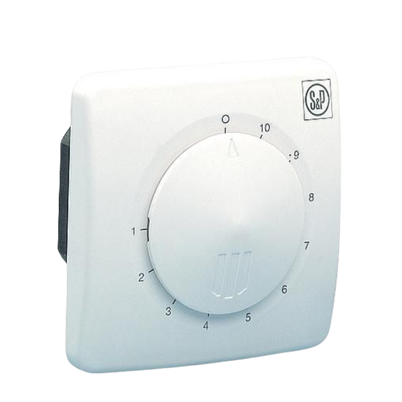 The Soler&Palau REB-2.5 NE is a flush-mounted electronic single-phase fan speed controller designed for installation in a standard in-wall electrical box. Equipped with a single rotary knob for ON/OFF switching and smooth speed adjustment, it includes a minimum speed calibration feature that ensures accurate, stable and energy-efficient control of fan motor speed in residential and commercial ventilation systems.